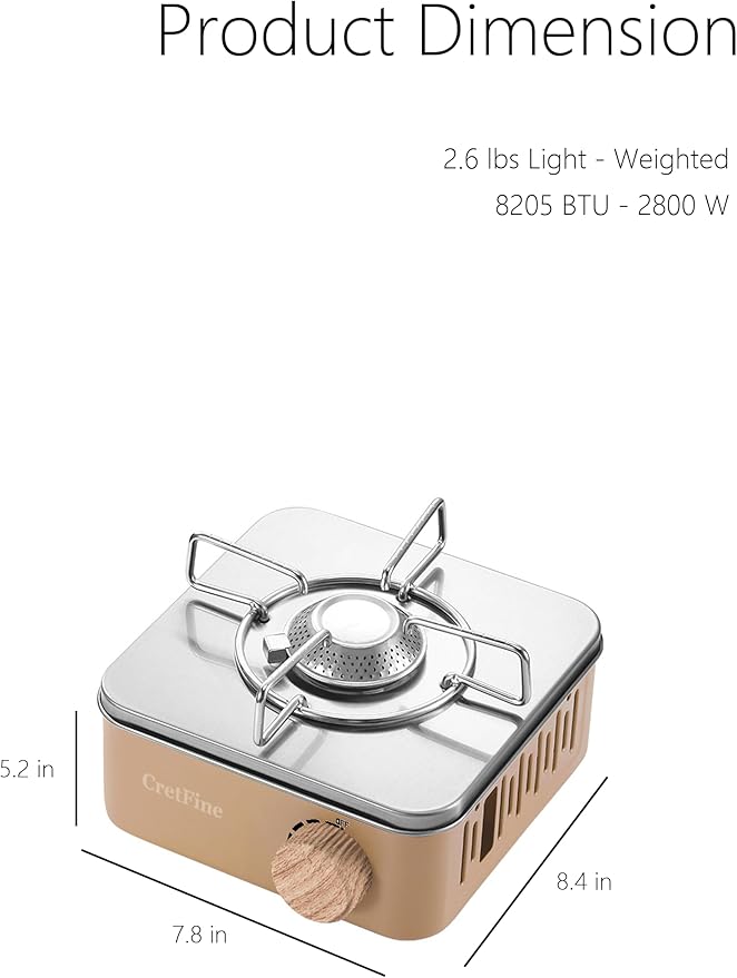 - 【75% Regular Size & 2.6lbs】Weighing only 2.6 lbs. With a square design and canister space beneath the grate, it saves 75% of the size of regular stoves. Perfect for camping, this portable gas stove measures 7.8" L x 8.4" W x 5.2" H, fitting easily in your backpack.