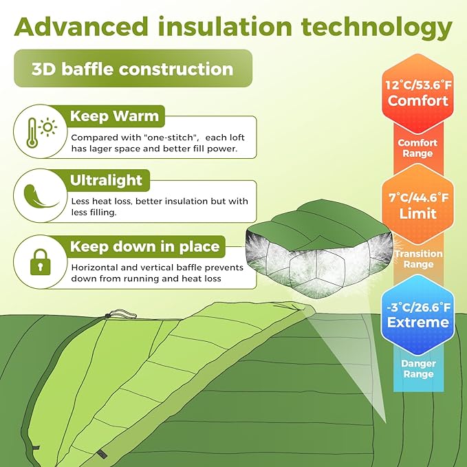 - DOWN SLEEPING BAGS: Filled with 300g COLDMASTER Down (51% RDS-Certified white duck down and 49% recycled synthetic), these sleeping bags for adults has unique vertical/horizontal baffle stitching to prevent cold spots, and windproof drawstrings and zipper draft tubes block chilling air flow. You can free your feet to stay cool in warm weather by opening the bottom zipper. Extreme temperature: 26.6°F, comfort temperature: 53.6°F, it provides warmth as a 3 season sleeping bag
