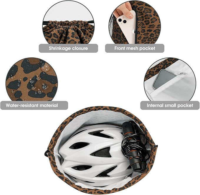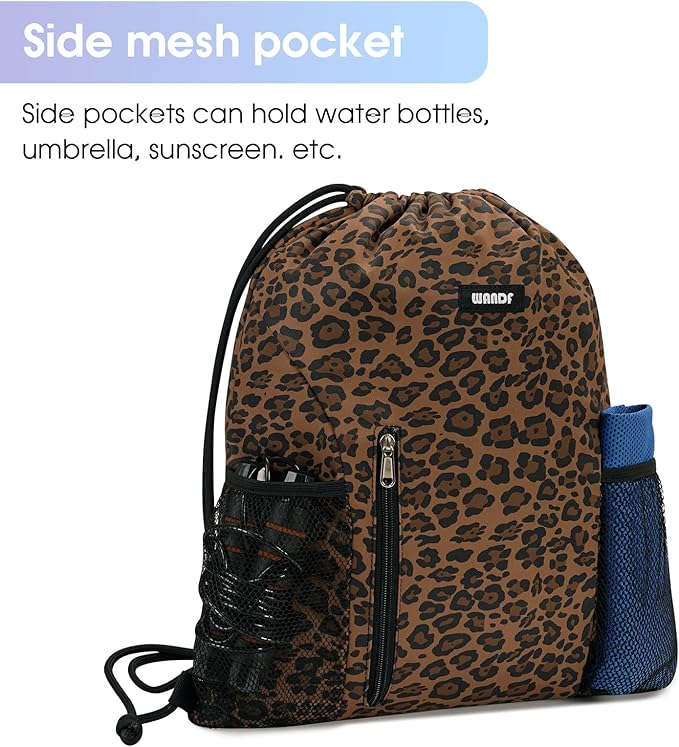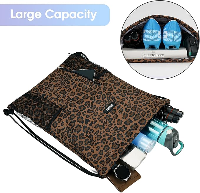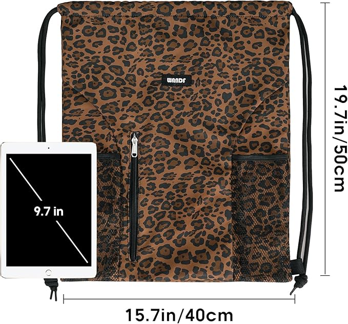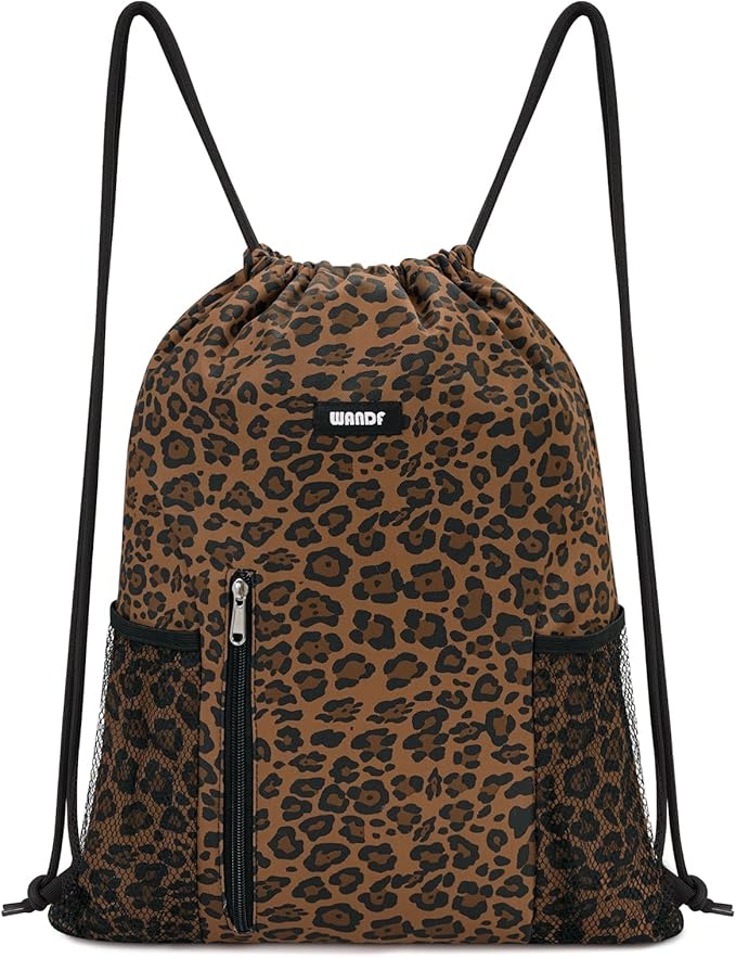 WANDF Drawstring Backpack Sports Gym Sackpack with Mesh Pockets Water Resistant String Bag for Women Men (Brown Leopard)