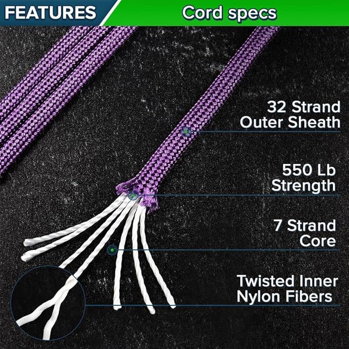 - MATERIAL: 550 paracord has 7 inner strands at the core which is what gives it the tensile strength. The outer sheath has 32 tightly woven strands which ensure the durability of the rope no matter the conditions. Our paracord is made of 100% Premium Nylon ensuring that our cord will hold up no matter what you throw at it.