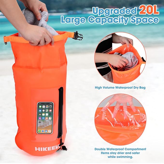 Hikeen Swim Buoy with Dry Bag 20L - Waterproof Touchscreen Large,Fully Waterproof Swim Safety Float for Open Water Swimmers and Training Triathletes, Kayaking, Be Bright, Be Safer