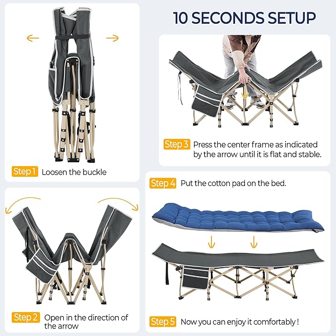 - Solid & Stable: Highly wear-resistant fabric mixed with a robust metal frame in super solid multiple X-shape structures after unfolding and anti-slip footpads, this portable outdoor bed enjoys trust-worthy solidity and stability