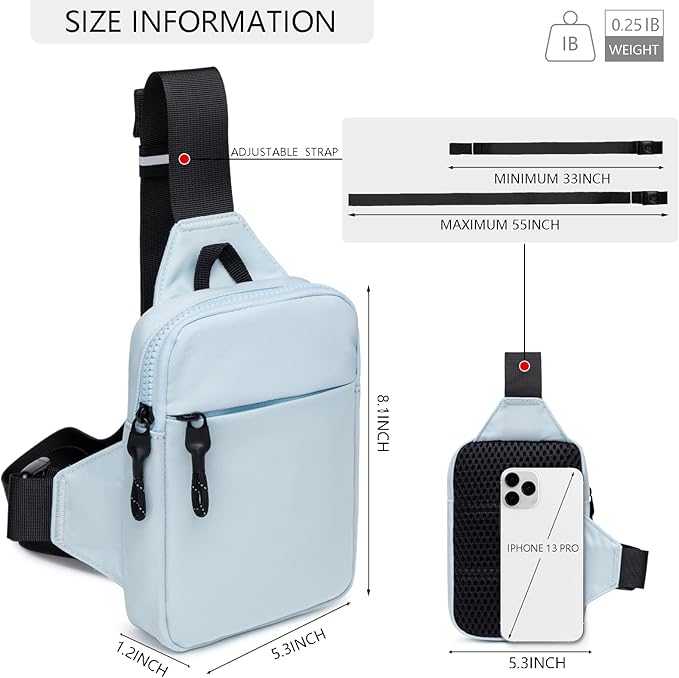 - Sling Bag Size & Adjustable Strap: Small crossbody sling bag size is 5.3 x 8.1 x 1.2 inches (0.25lb). The wide nylon shoulder strap can be adjusted from 31'' to 55.1''.Suitable for different body types. You can adjust the strap according to fit to make daily use more comfortable