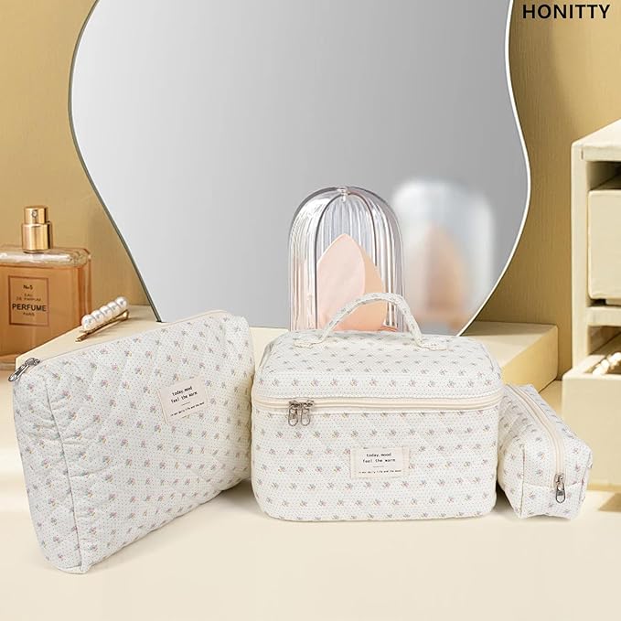 Makeup Bag,Quilted Cosmetic Bags,Large Floral Make Up Organize bag,Makeup Bag Set for Women,Flower Travel Toiletry Bag