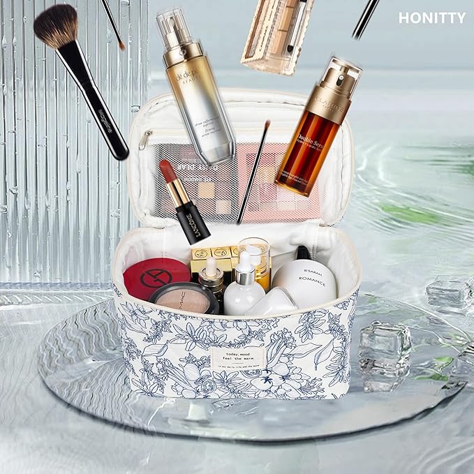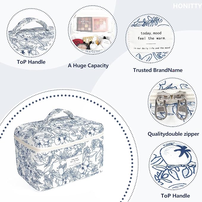 Makeup Bag,Quilted Cosmetic Bags,Large Floral Make Up Bags for Women, Makeup Organize,Flower Travel Toiletry Bag