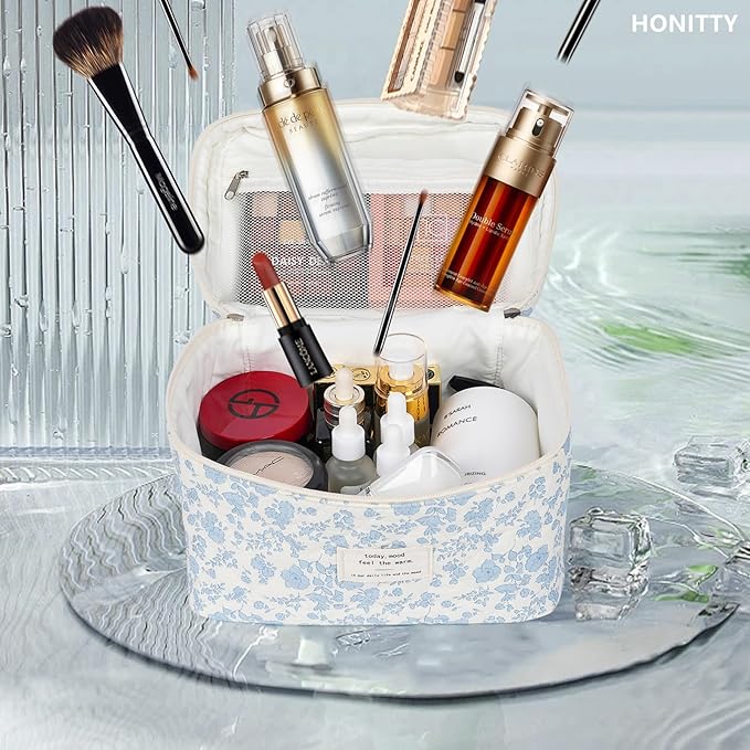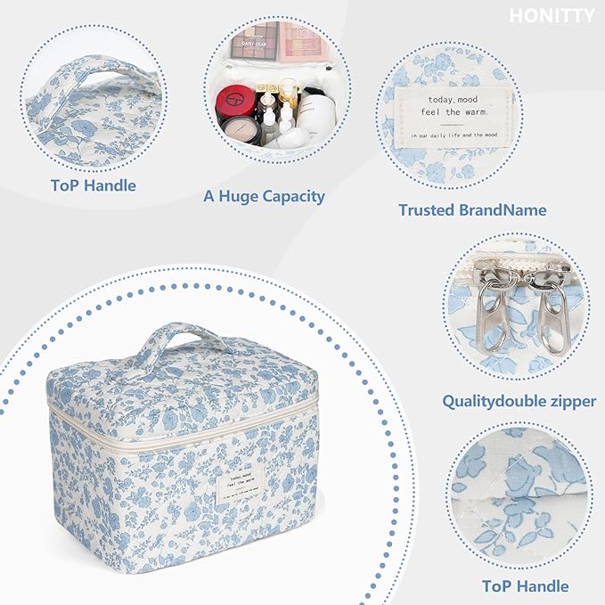 Makeup Bag,Quilted Cosmetic Bags,Large Floral Make Up Bags for Women, Makeup Organize,Flower Travel Toiletry Bag