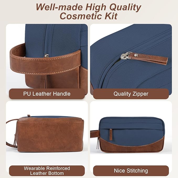 - Portable design: Leather handle makes the Dopp kit for toiletries easier to carry and hang, reinforced bottom with leather makes it wearable. The combination of zipper & zipper ear makes it easier to hold and zip up and down. This toiletry bag is in a perfect size that can be packed up and tucked away in the suitcase