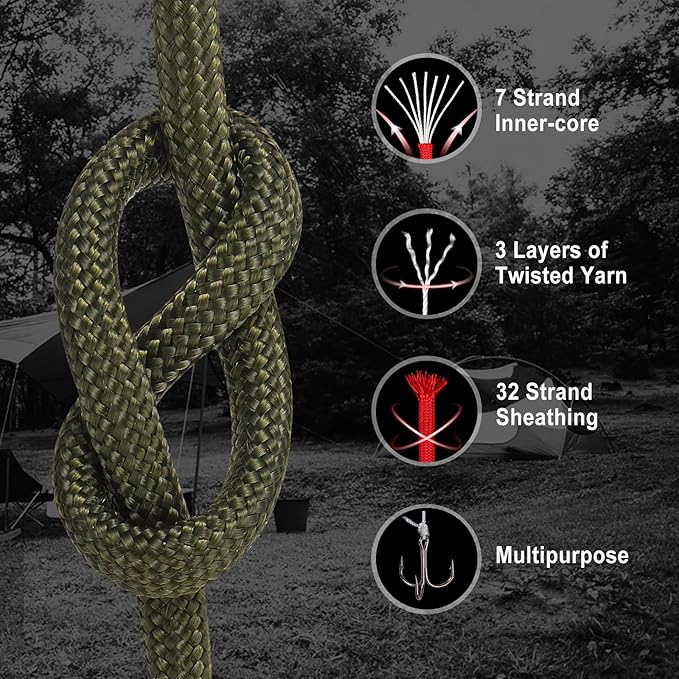 - High Quality Paracord - Our Paracord rope is 5/32" in diameter (about 4mm), featuring a robust 32 strand woven sheath and a core of 7 inner strands for strength and durability. Each strand is composed of three layers of tightly twisted yarn, ensuring maximum reliability in any situation.