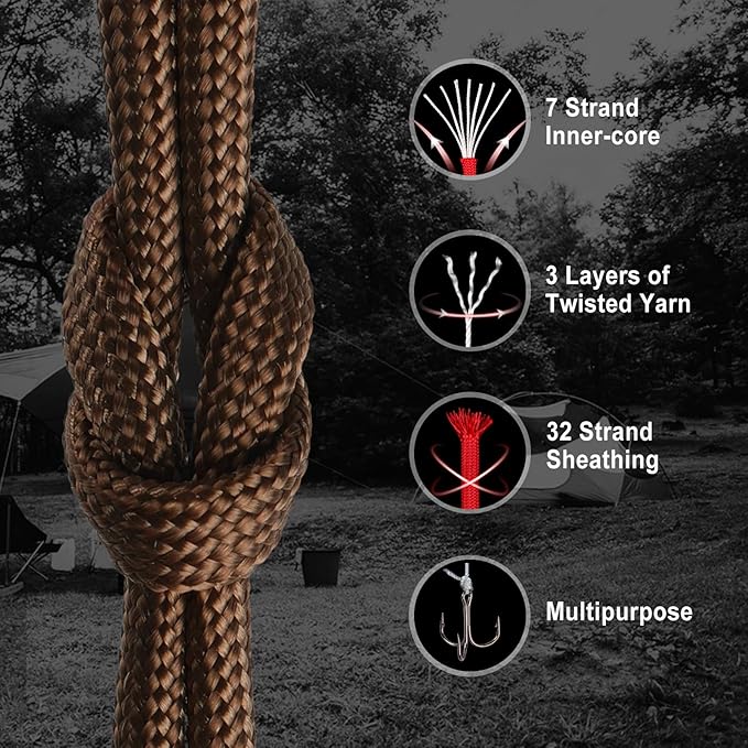 - High Quality Paracord - Our Paracord rope is 5/32" in diameter (about 4mm), featuring a robust 32 strand woven sheath and a core of 7 inner strands for strength and durability. Each strand is composed of three layers of tightly twisted yarn, ensuring maximum reliability in any situation.