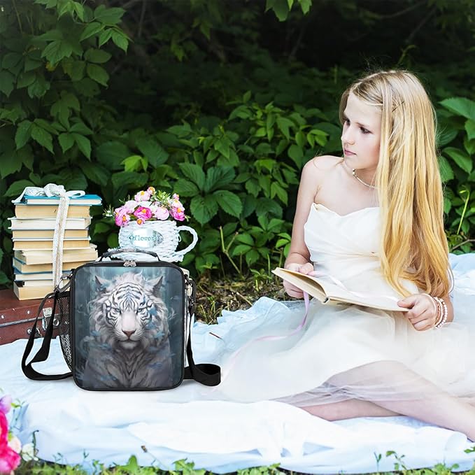 Animal Lunch Box for Kids, Watercolor White Tiger Lunch Bag for Boys Girls, Reusable Insulated Waterproof Lunch Box with Adjustable Shoulder Strap Thermal Cooler Tote Bag for School Daycare Picnic