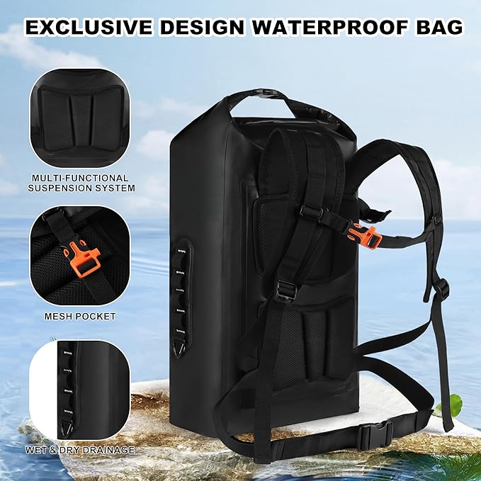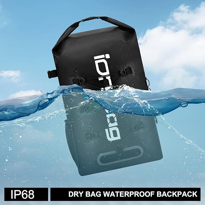 - [SEALED WATERPROOF]: Dry bags waterproof with high frequency stitching technology, no pinholes, 100% percent air and water leakage proof. Dust and waterproof rating is IP-68, the waterproof backpack for travel will keep your items dry even if it is completely submerged in water. Extremely easy to use, just roll the top down flush a couple times and snap the carabiner. No need to worry about wet clothes in the rain when you go out with your friends.