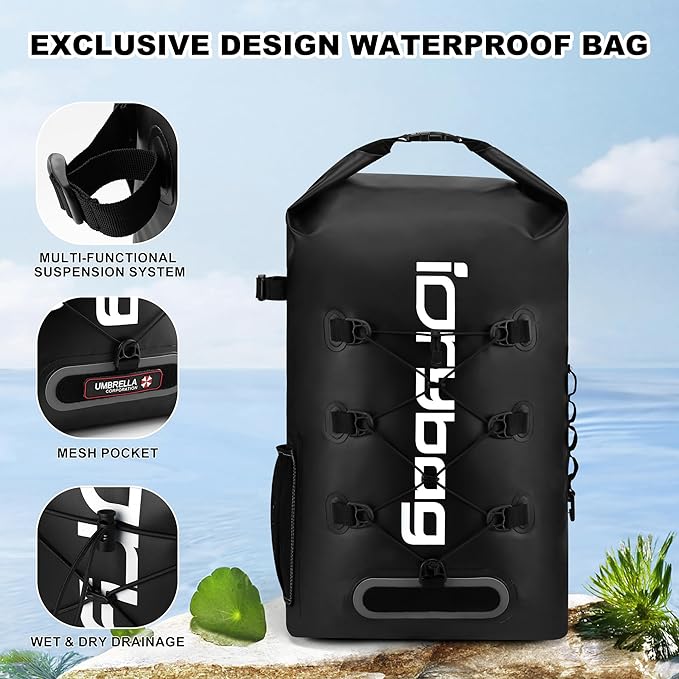 - [MULTI-FUNCTIONAL]:IDRYBAG waterproof backpack for travel designed by famous designers, it is sturdy, practical and beautiful, the front removable elastic strap used to fix shoes or water bags, The dry bags waterproof side mesh pockets can be put water bottles, the MOLLE system hang travel essentials at will, and worth mentioning that there is a section at the bottom for DIY badges which will allow you to show your uniqueness in front of your friends.