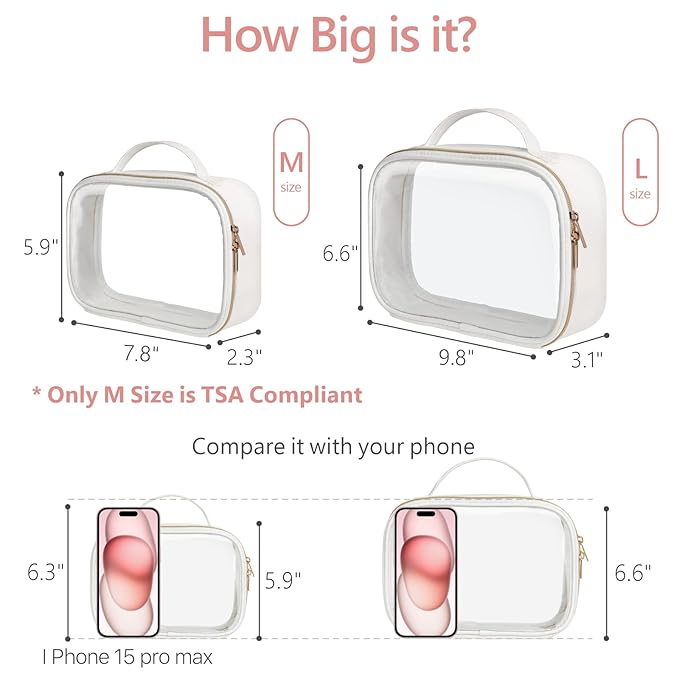 - TSA Approved: The medium size clear makeup bag is 7.8 x 2.3 x 5.9 inch, it follows the TSA's 3-1-1 Liquid Rule published by TSA. Transparent Side, Scanning Inside Easily. Note: the large size clear bag is 9.8 x 3.1 x 6.6 inch, exceeds one quart and is not TSA-approved