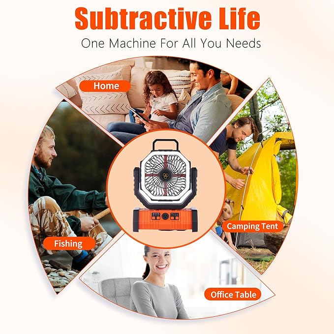 - 【20000mAh Mighty Rechargeable Battery】 This camping fan rechargeable with an internal high-capacity battery takes only 8-10 hours to be full charged by using the Type-C cable, runtime from 14 to 60 hours in different modes, ensuring a cool sleep at night. Say goodbye to battery anxiety during camping trips, hurricanes, or emergency power outages. The 5V/3A output port ensures your essential devices—like phones, GPS, and other camping gear stay charging and ready to go.