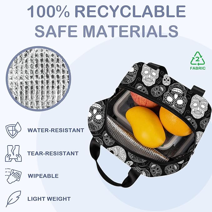 Insulated Lunch Bag, Black and White Skull Head Lunch Box for School Student Kids Boys Girls,Leakproof Small Lunch Tote for Adult Men Women,Reusable Lunch Cooler Tote Bag for Office Work Picnic