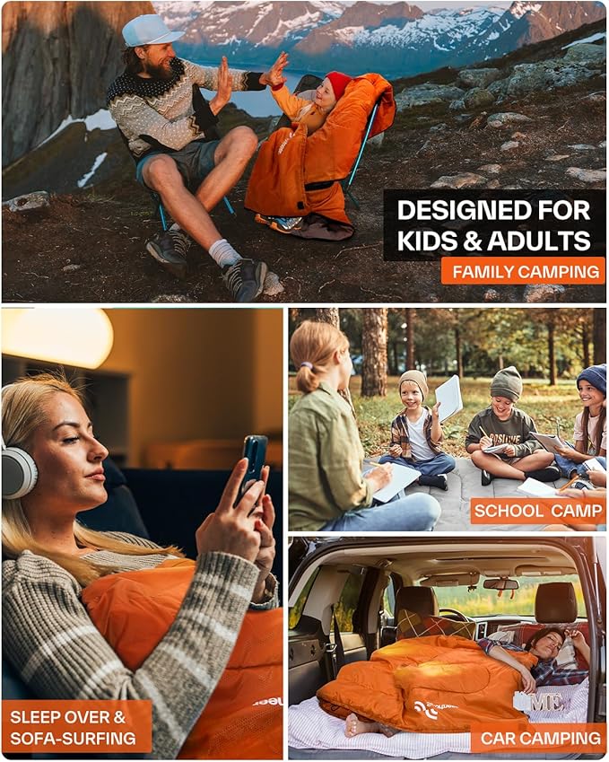 - CAMP IN COMFORT FOR ALL AGES - Bring home comforts to the great outdoors, ensures a restful night's sleep after a day of activities with your family. Designed for all ages, with vibrant colors that appeal to kids and adults alike, this sleeping bag for kids and adult is a great gift idea for your childern when class camping,sicence camp and summer camps approaching! Experience great warmth and comforts with this kids sleeping bag!