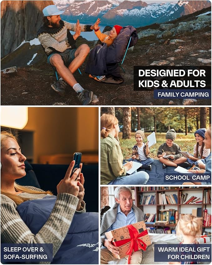 - CAMP IN COMFORT FOR ALL AGES - Bring home comforts to the great outdoors, ensures a restful night's sleep after a day of activities with your family. Designed for all ages, with vibrant colors that appeal to kids and adults alike, this sleeping bag for kids and adult is a great gift idea for your childern when class camping,sicence camp and summer camps approaching! Experience great warmth and comforts with this kids sleeping bag!