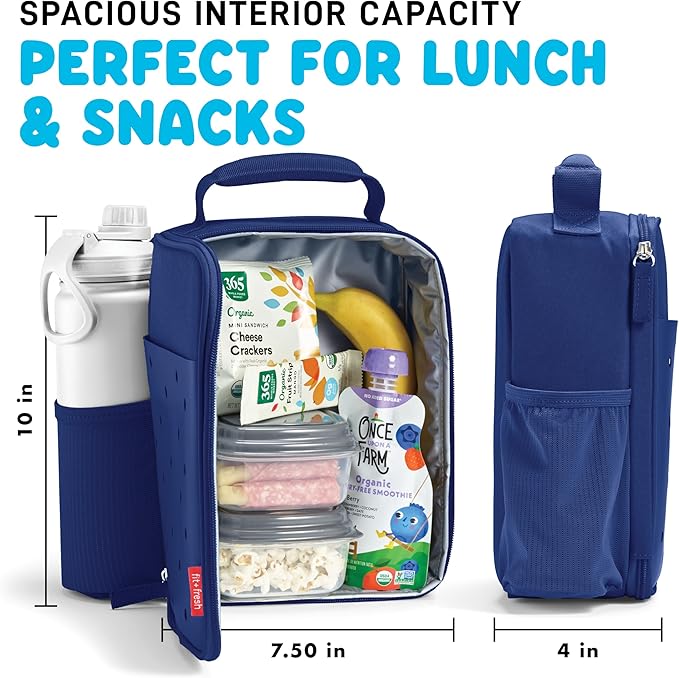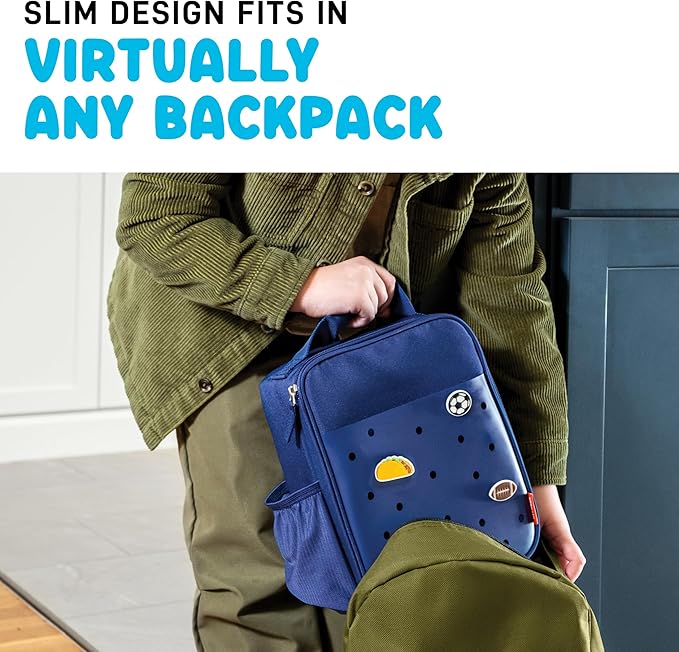 Fit & Fresh Charm Lunch Bag For Kids, Thermal Insulated Lunch Box For Kids Boys & Girls With Shoe Charm Slots For Personalization, School Lunch Box, Navy Blue