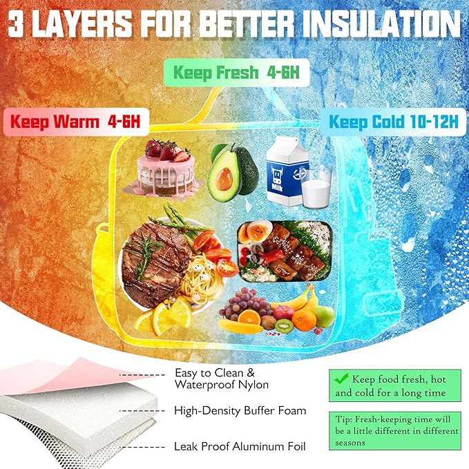 - Upgraded Insulation Effect: The lunch box features upgraded thickened aluminum foil and dense pearl cotton insulation for improved thermal retention. The lining is also easy to clean and wipe off stains with a tissue.