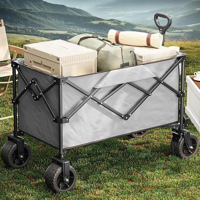 - High Performance: This folding wagon cart with big wheels is constructed with reinforced 600D Oxford fabric over a sturdy steel frame, achieving up to 300-pound weight capacity along with great tear resistance