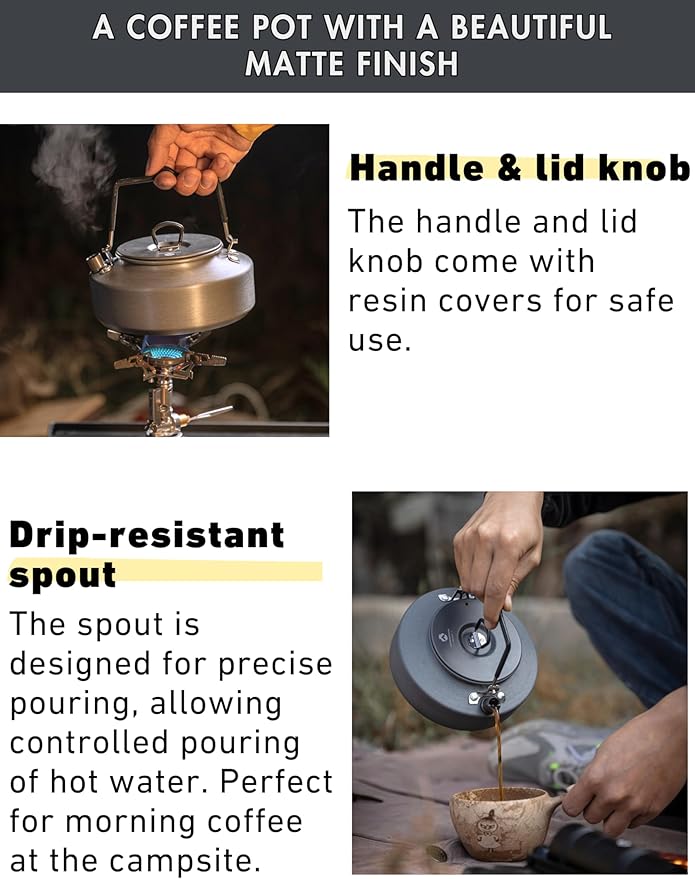 - 【Drip-resistant spout】The spout is designed for precise pouring, allowing controlled pouring of hot water. Perfect for morning coffee at the campsite.