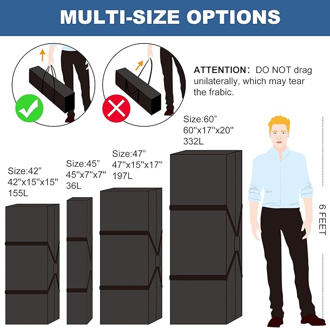 - Dimensions when full: 60" x 20" x 17" (L*W*H) with extra large capacity, travel bag with roomy interior for storing items. Ideal for camping, hunting and sport travel and even fits for umbrella style strollers