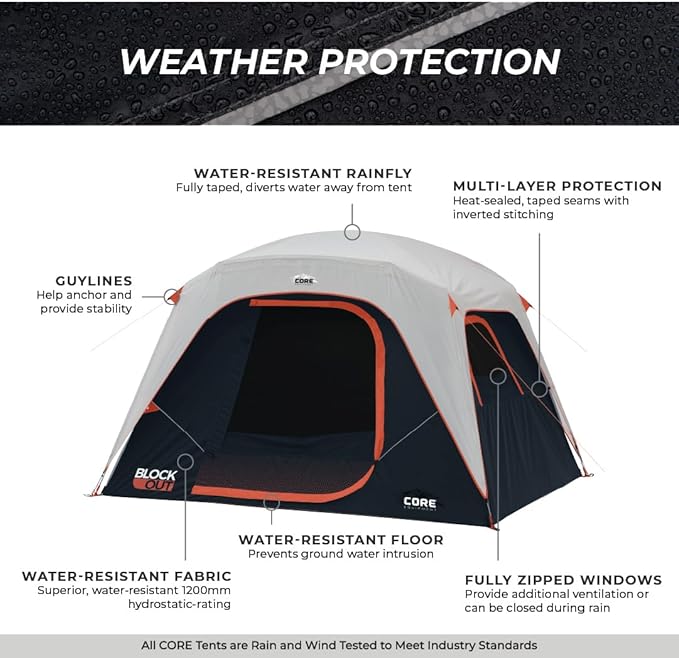 CORE Blackout 6 Person & 9 Person Dome Tent | Best Car Camping Outdoor Family Camp Tent | Included Storage Pockets for Camping Accessories | Portable Tent for Camping with Carry Bag