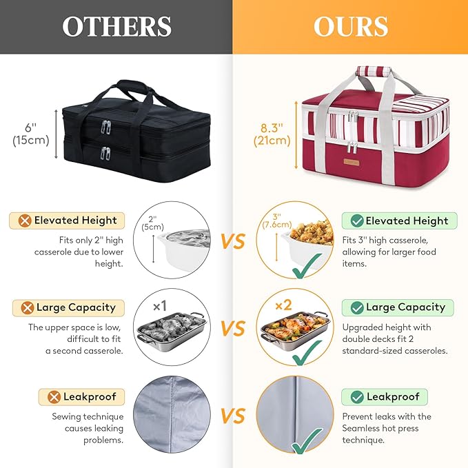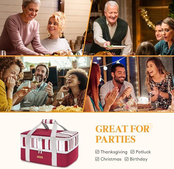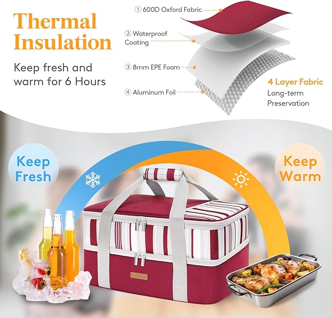 Double Decker Insulated Casserole Carrier for Hot or Cold Food, Lasagna Lugger Tote for Potluck Parties/Picnic/Cookouts, Fits 9"×13" Baking Dish, Red