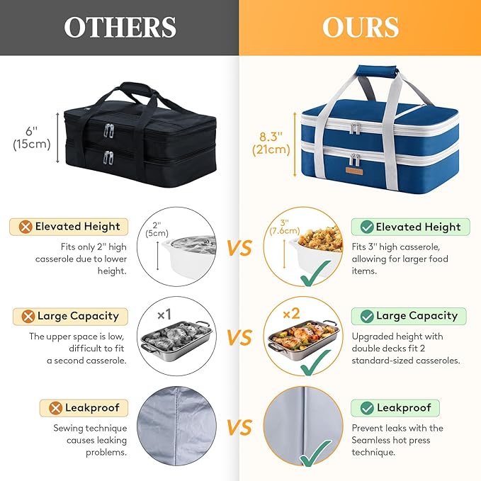- Dual Compartments: The externally measured dimensions are 15.7" × 11.4" × 8.3" (L × W × H). It can fits 9" × 13" , up to 11" × 15" casserole and baking dishes (not included).