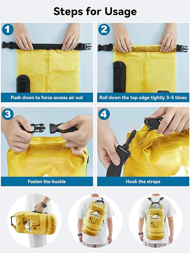 - Easy to Use & Clean - Just place your gear or items in the dry bag, grab the top woven tape and roll down tightly 3 to 5 times, then fasten the buckle to complete the seal and finally hook the shoulder strap. The dry bag is easy to wipe clean due to its smooth surface. It comes with adjustable and removable shoulder straps, easy to adjust the length to your liking.
