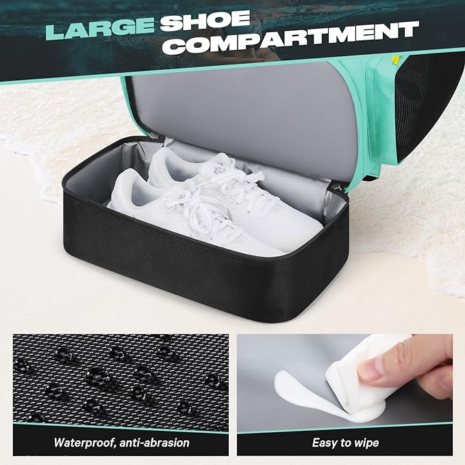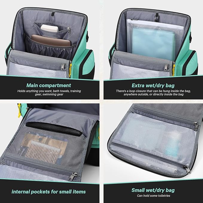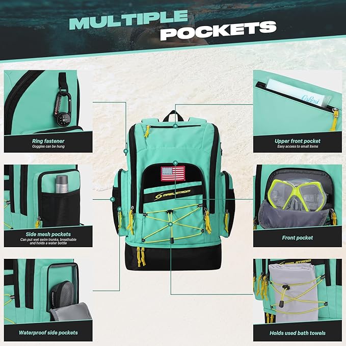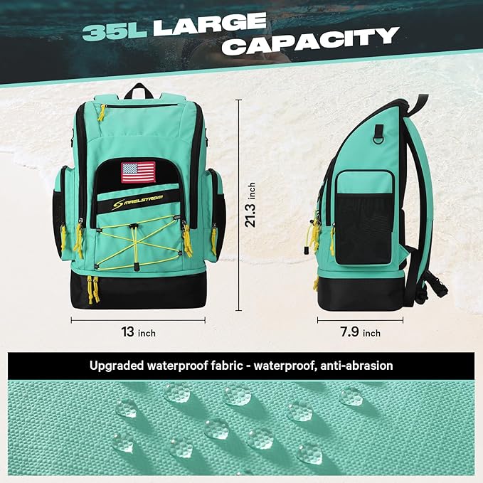 - Waterproof & Spacious: Our swimming backpack is crafted from upgraded waterproof polyester, ensuring durability against water and wear. With a generous 35L capacity, it accommodates all your swimwear, activewear, and training gear.
