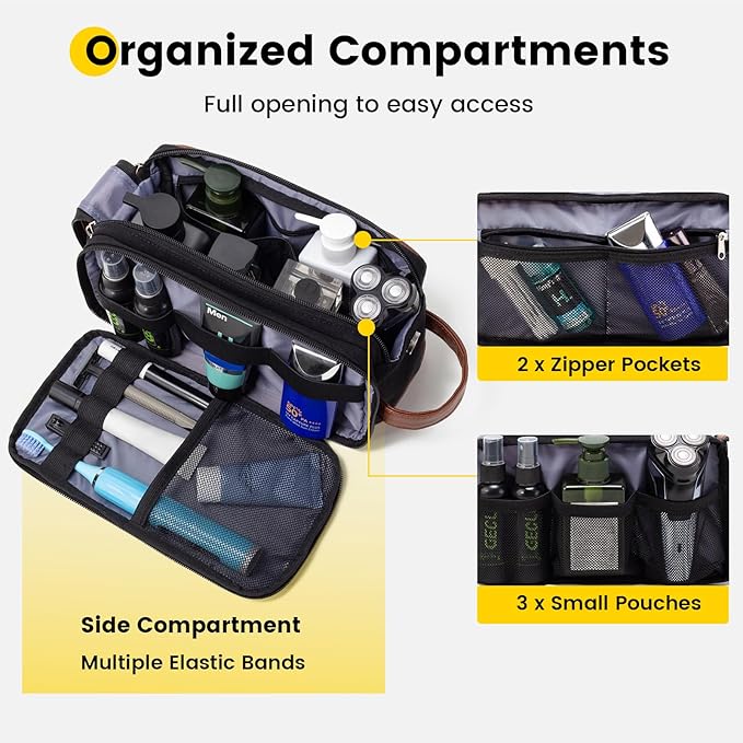- Wide opening: The retro design makes this travel toiletry bag for men look classic and stylish. Featuring a double zipper opening, these toiletry bags allow you to reach into the main compartment quickly and easily access the items you need