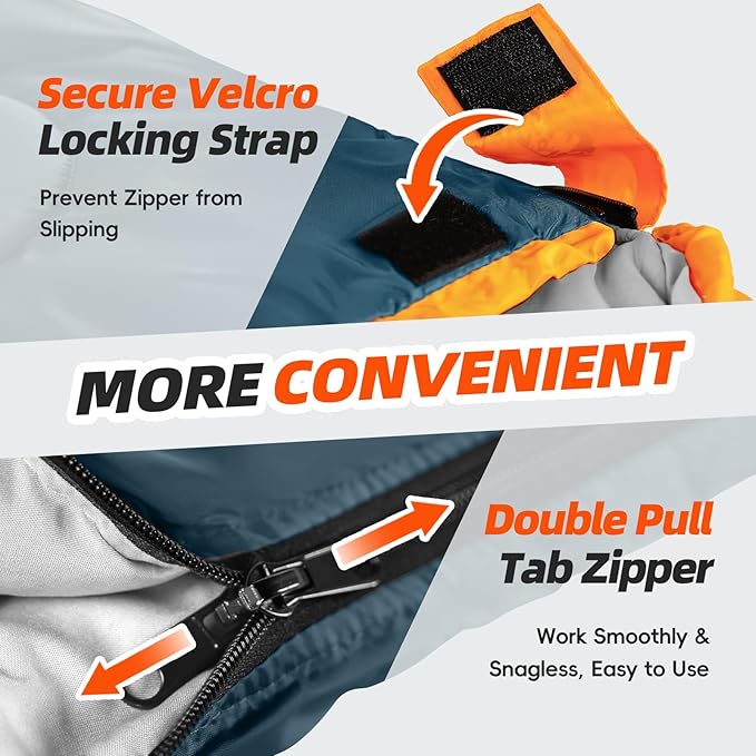 - EXCELLENT DESIGN : The double pull tab zipper on the right side makes it easy for you to open and close from inside or outside, work smoothly & snagless. The zipper at the bottom lets you ventilate the foot section for better temperature control. On warm nights, unzip it and use like a blanket