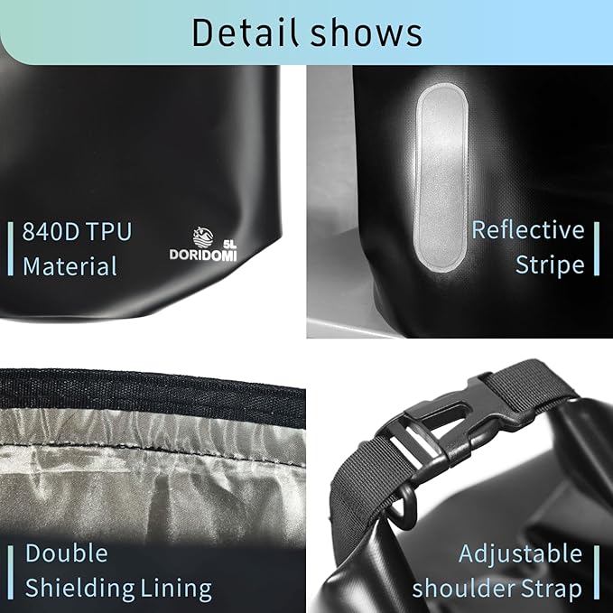 - ULTIMATE PROTECTION WITH SIGNAL BLOCKING MATERIAL: DORIDOMI black faraday waterproof dry bag offers unparalleled security for your devices. Utilizing 840D TPU and double-layered signal-blocking fabric, it creates a Faraday cage effect, shielding your electronics from unwanted EMP interference. Whether you're outdoors or just seeking privacy, this signal blocking bag is your perfect companion.