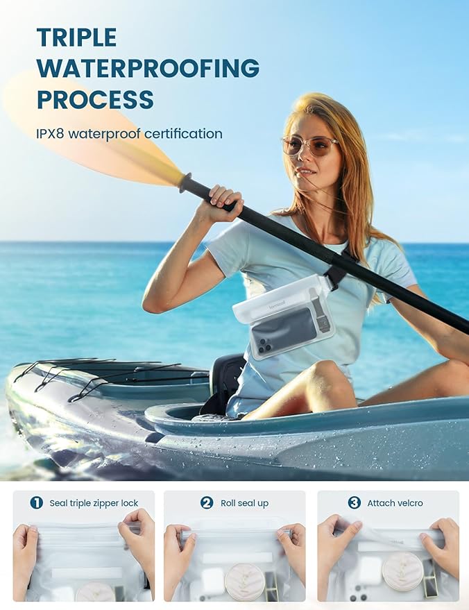 - Triple Sealing Tech-100% Waterproof : Lamicall 2024 upgraded waterproof bag featuring superb waterproof seal. With a three-zipper closure system and folding Velcro at the top, it ensures a perfect seal to keep your phone and valuables safe and dry. The super waterproof seal allows you to enjoy boating, kayaking, fishing, hiking, surfing, camping without worrying about water and dust seeping in. Travel, Vacation Must haves.