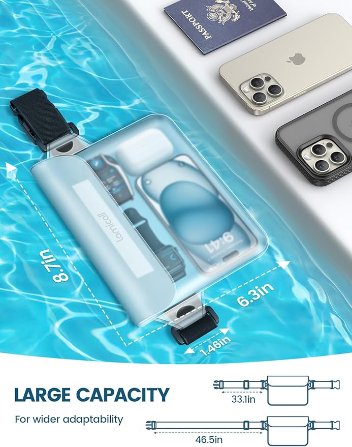 - 8.7" * 6.3" Large capacity : The size of the waterproof waist bag is 8.7 * 6.3 inches (22cm*16cm). Our waterproof bags for swimming has large storage space and good waterproof performance to keep your valuables dry. You can safely store your personal belongings, such as mobile phone, passport, keys, sunglasses, headphones, sun cream and other important items (even an iPad Mini). And it's suitable for mobile phones up to 8.7 inches, such as iPhone 16/15/14/13/12/11 Pro Max/Pro/Plus/Mini, Galaxy, other smartphones.