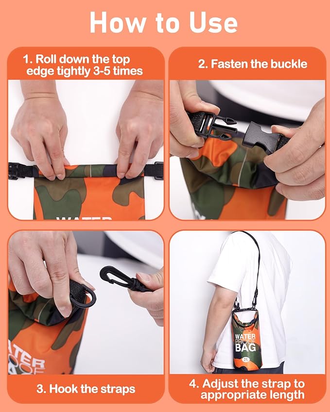 - Waterproof: Made from durable, waterproof material, the 2L camo roll top bag ensures your items stay dry in any wet environment. The roll-top closure provides a secure, watertight seal. The zippered wet bag with one pocket is suitable for protecting contents from either getting wet or the wet contents leaking out, which is more made for keeping a wet swimsuit, gym clothes, diapers, etc.