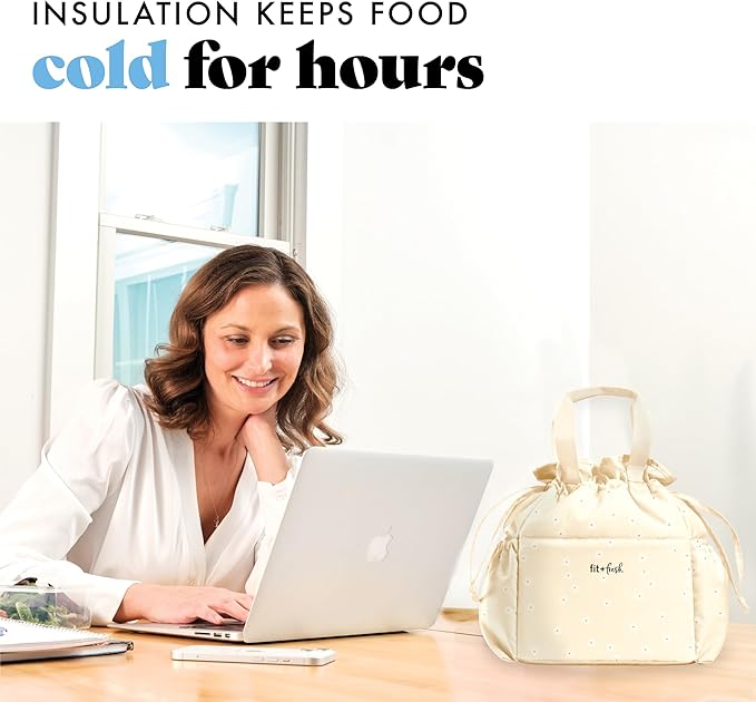 Fit & Fresh Lunch Bag For Women, Insulated Womens Lunch Bag For Work, Stain-Resistant Large Lunch Box For Women With Containers, Cinch Closure Cromwell Bag, Ivory Daisies