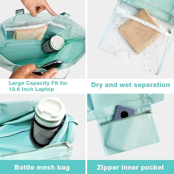 • Multiple Pocket Design: Zipper inner pocket for cellphone, money, keys and small items. Wet and dry separation pockets for towels, dirty clothes, etc. Water bottle fixed mesh bag