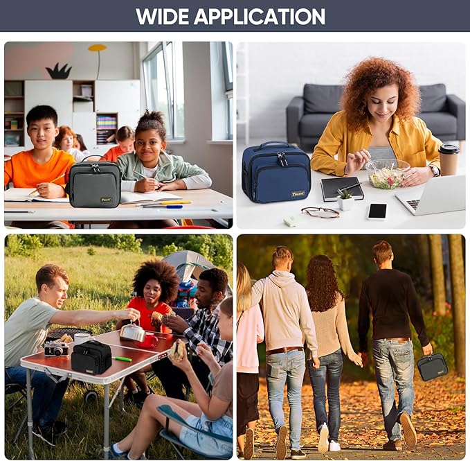 - [SPACIOUS AND VERSATILE] With a generous capacity, this insulated lunch box easily accommodates your entire meal. The spacious main compartment offers ample space, while the front and side pockets provide additional storage for utensils, napkins, keys, or small essentials. The large lunch bags for men measures 11''x8.5''x9.5'', the medium cooler bag measures 10''x8''x8'' and the small measures 9"x5"x7.5"