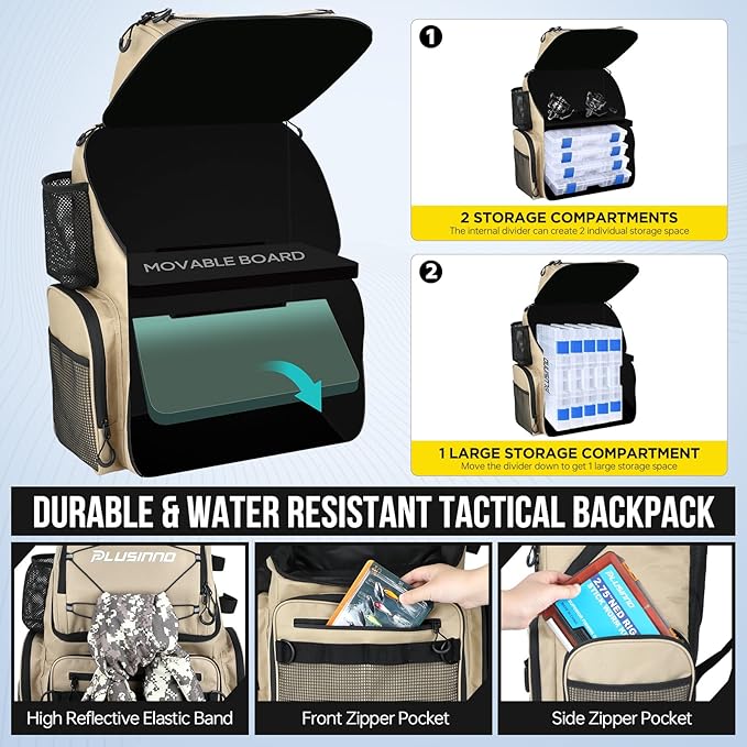 - Multifunctional Fishing Tackle Bag - PLUSINNO fishing backpack is designed with multiple pockets and storage areas tailored for different fishing gear. This fishing bag includes side pockets, a bottle pocket, numerous D-rings, and elastic cords for hanging towels or clothes... Providing convenient storage for fishing rods, bottles, keys, fishing pliers, and more. Each pocket is strategically placed for easy access, making the PLUSINNO fishing backpack an essential companion for any angler.