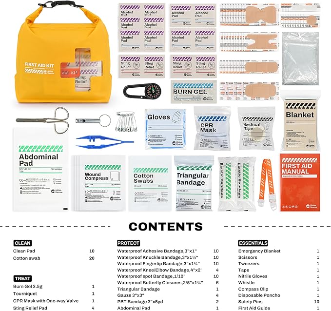 RHINO RESCUE Waterproof First Aid Kit, Lightweight Boat Dry Bag, Emergency Survival Supplies for Outdoor Kayak Floating Swimming & Camping FSA HSA Eligible (Yellow)