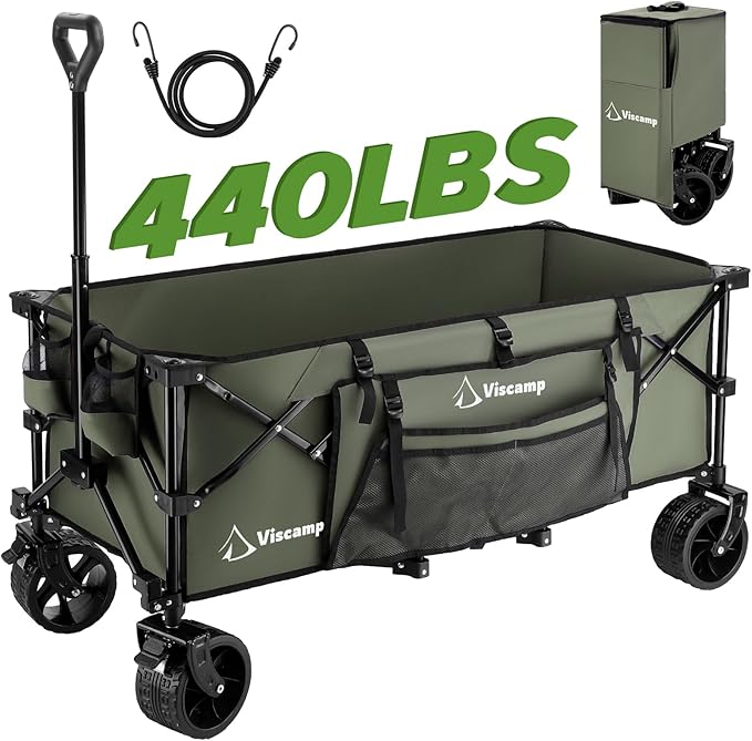 48''L Wagons Carts Foldable, 440Lbs Beach Collapsible Wagon Heavy Duty Garden Cart with Wheels and Elastic Rope Wagon for Shopping Camping and Storage(Army Green)