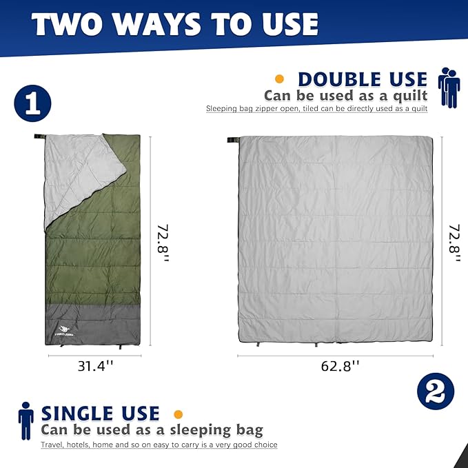 - 【2-WAY ZIPPERS】The envelope sleeping bag has a 2-way zippersr, and the bottom of the sleeping bag also has an opening. Two sleeping bags can be joined together to make a double sleeping bag, or zipped open as a blanket for summer use.