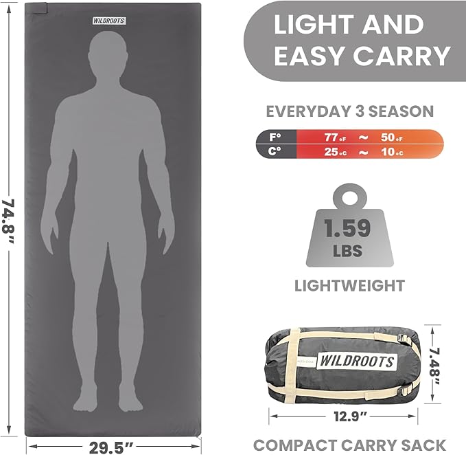 - Suitable for three seasons: Our high-quality sleeping bag is designed specifically for temperatures ranging from 50℉ to 68℉ (10℃ to 20℃). The double-layer filling technology will keep you warm and prevent moisture intrusion, allowing you to enjoy a comfortable sleep during hiking, outdoor camping, traveling, or any other outdoor activities