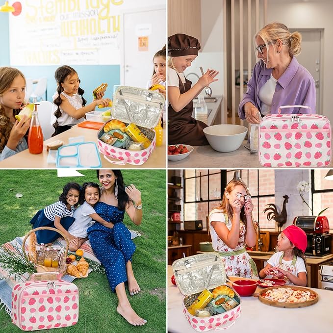 - It's super popular and very classy with beautiful strawberry pattern,The lunchbox bag is leak-proof and friendly to carry on. The bag is suitable perfect for kids, children, girls to school, women to work. You will love to bring this adorable insulated lunch box to school everyday!
