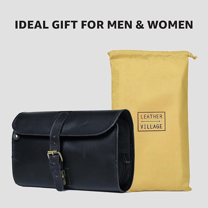 LEATHER VILLAGE Hanging Toiletry Bag for Men & Women, Handcrafted Vintage Cosmetic & Shaving Organizer Travel Dopp Kit- Black