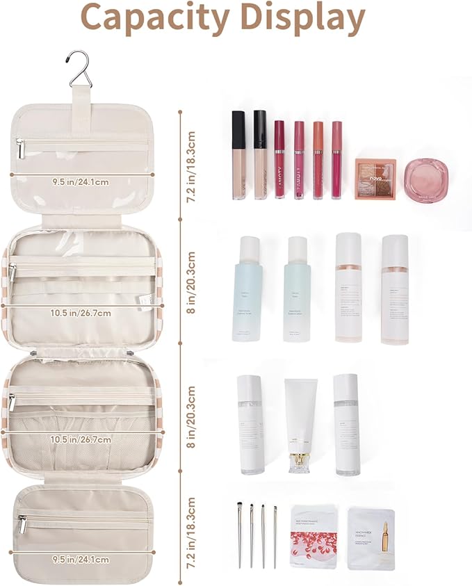 - NOT BULKY DESIGN - Large Capacity yet compact design, weighing 14 ounces. large metal hook allows hanging the toiletry case from towel rack, coat hook or whereever is available, making your toiletries and cosmetics displayed well for easy access