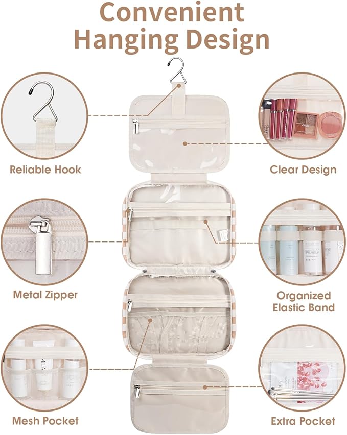 Narwey Hanging Toiletry Bag for Women Travel Makeup Bag Organizer Toiletries Bag for Travel Size Essentials Accessories Cosmetics (Light Checkerboard (Medium))