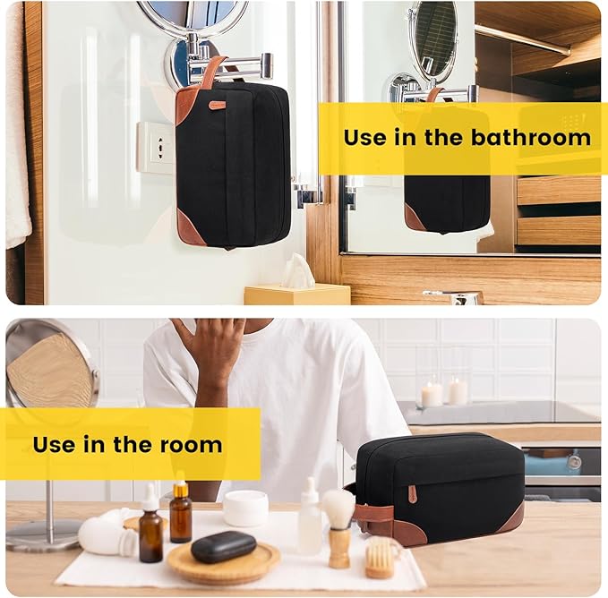 - Quality & water-resistant material: The toiletry travel bag is made of sturdy & wearable canvas material that has no unpleasant smell. The canvas and PU leather make the bag itself very well-constructed to keep the shape and protect your toiletries from splashed water